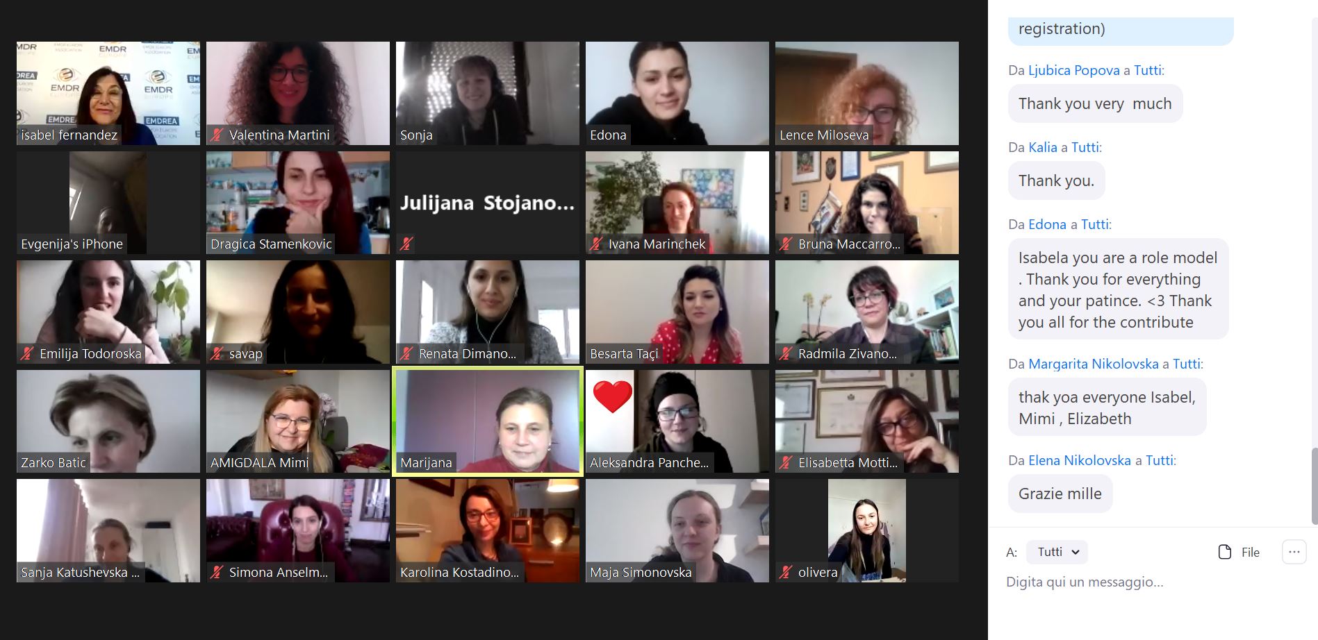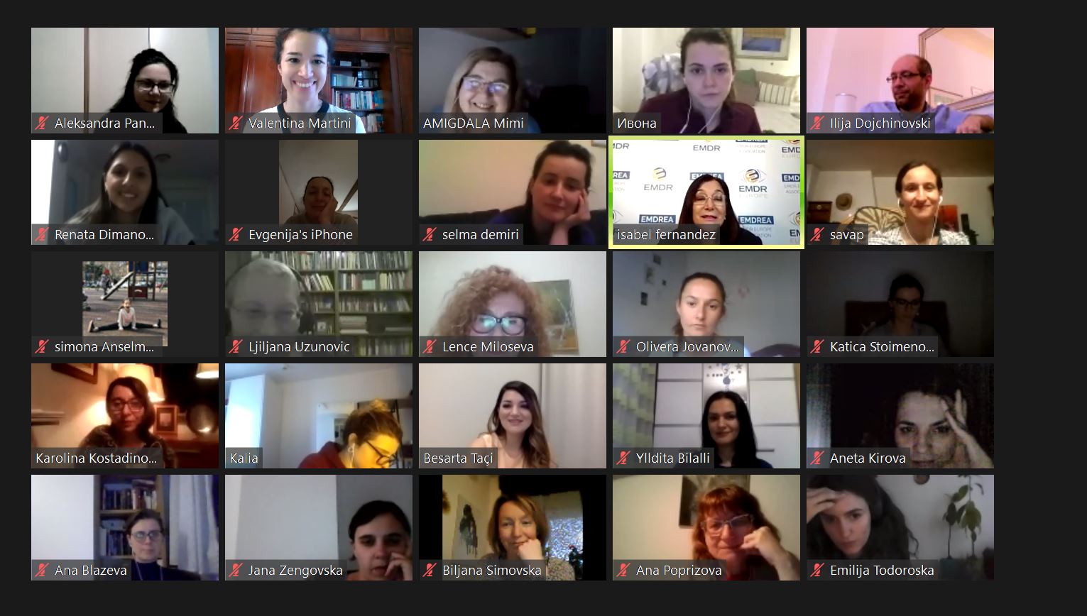 On March 27th and 28th 2021, Isabel Fernandez, with the help of 5 Italian facilitators, organised a Level 1 training in EMDR in North Macedonia, funded by EMDR Italy and EMDR Europe. 50 therapists successfully completed the training, including psychologists from the Ministry and the Army of the Republic of Northern Macedonia. The training received enthusiastic feedbacks and it represents a further step towards the establishment of the EMDR Macedonian Association in North Macedonia. The foundation of a new National Association will open new opportunities for psychologists to participate in EMDR Europe international activities. The training would not have been possible without the huge support from Elisabetta Mottino, Italian psychologist living in Skopje and the Italian Ambassador Andrea Silvestri. We would like to thank EMDR Europe and all the people involved in this project!